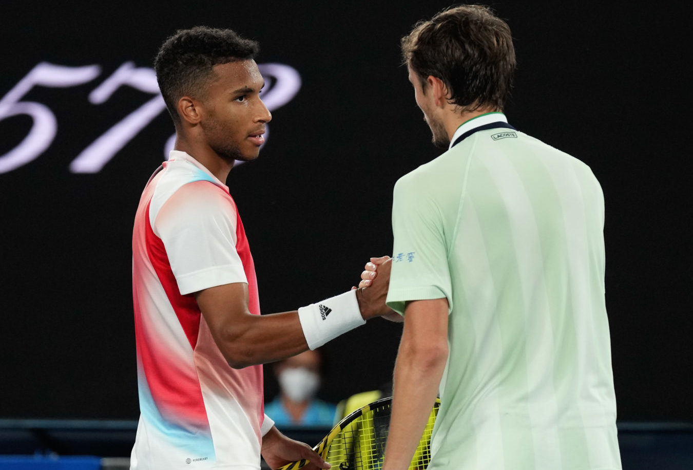 Felix AUGER-ALIASSIME (CAN) and Daniil MEDVEDEV (RUS) shake hands after their match at the quarterfinals of the Australian Open on Rod Laver Arena at Melbourne Park in Melbourne on Wednesday, January 26, 2022. MANDATORY PHOTO CREDIT Mark Dadswell/TENNIS AUSTRALIA