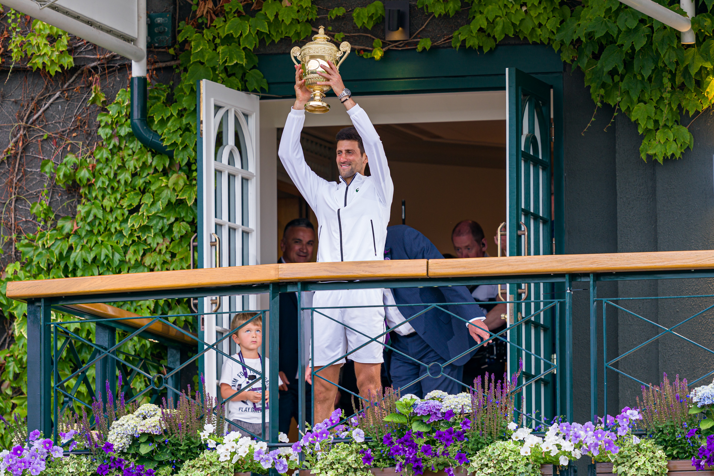 Wimbldon, Great Britain - July 14: Novak Djokovic of Serbia celebrates after winning the Gentlemen's Singles Final Match of 2019 Wimbldon Tennis Championships Day 13 on 14 July 2019 at The All England Lawn Tennis Club (AELTC), Great Britain. (©Andy Cheung/ArcK Images/arckimages.com/UK Tennis Magazine/International Sports Fotos)