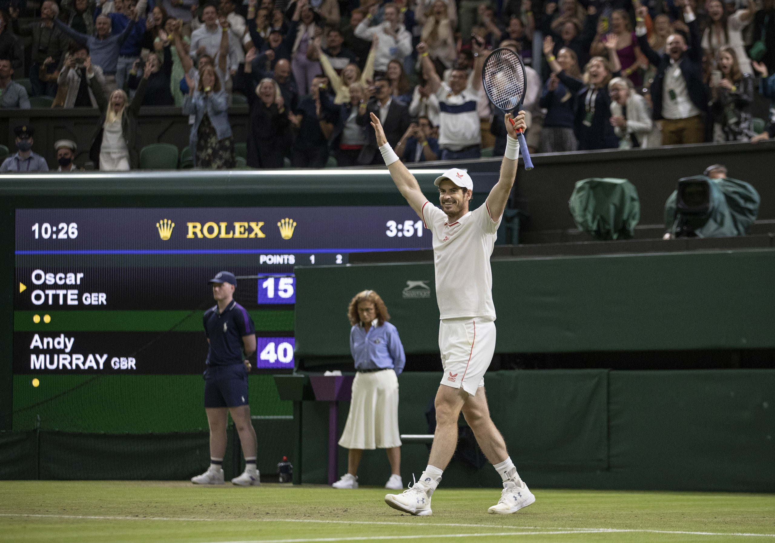 Andy Murray (GBR) waves to the crowd after defeating Oscar Otte (GER) in the second round of the Gentlemen's Singles on Centre Court at The Championships 2021. Held at The All England Lawn Tennis Club, Wimbledon. Day 3 Wednesday 30/06/2021. Credit: AELTC/Ian Walton