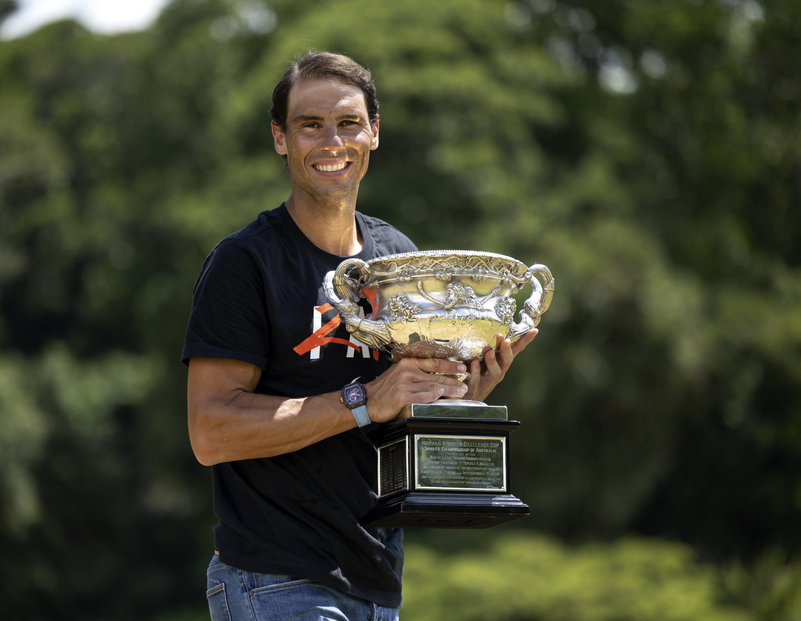 Rafael NADAL (ESP) poses with the Norman Brookes Challenge Cup at Government House in Melbourne on Monday, January 31, 2022. MANDATORY PHOTO CREDIT Fiona Hamilton/TENNIS AUSTRALIA