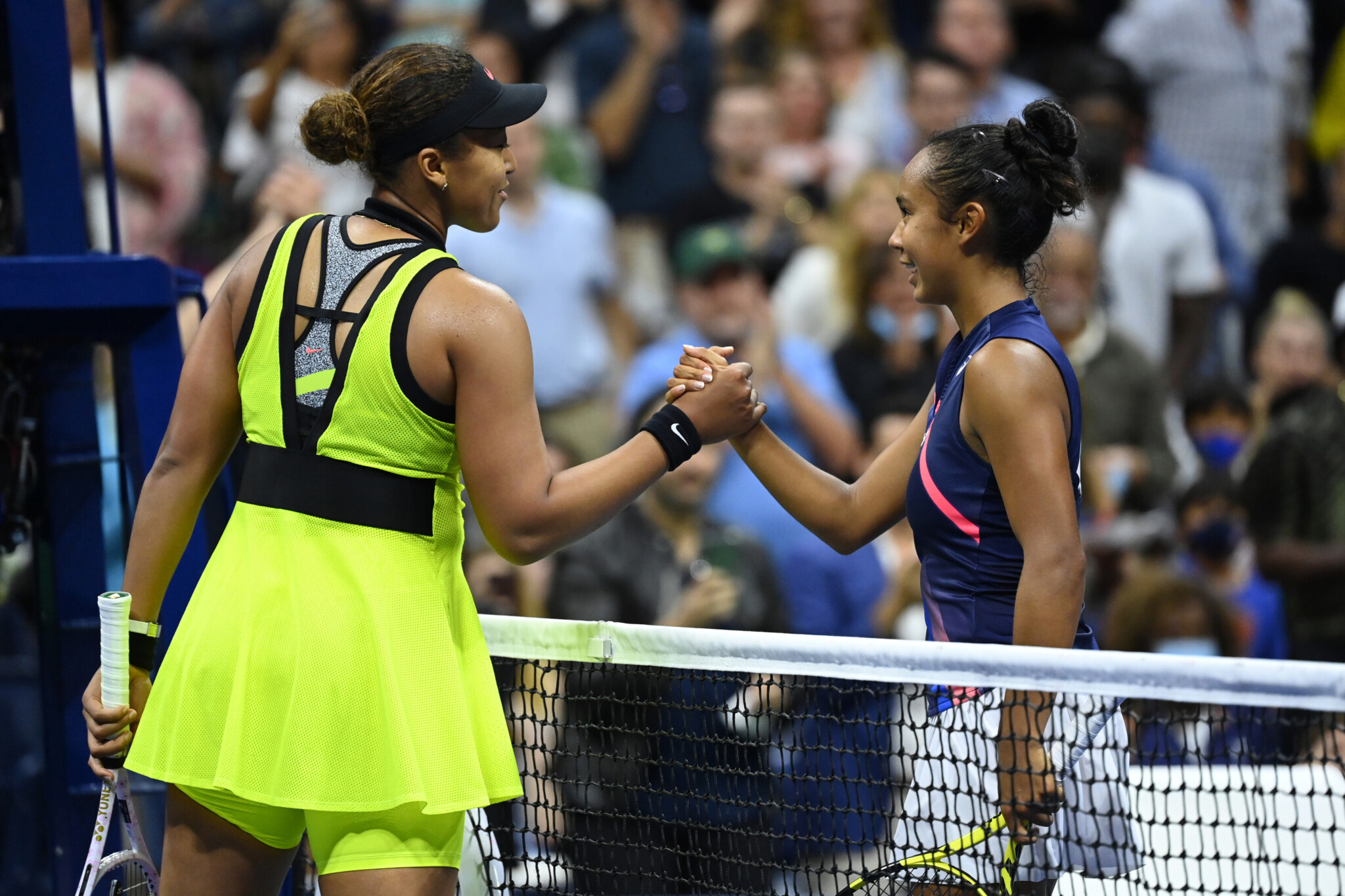 Leylah Fernandez high fives Naomi Osaka after winning a Women's Singles match at the 2021 US Open, Friday, Sep. 3, 2021 in Flushing, NY. (Garrett Ellwood/USTA)