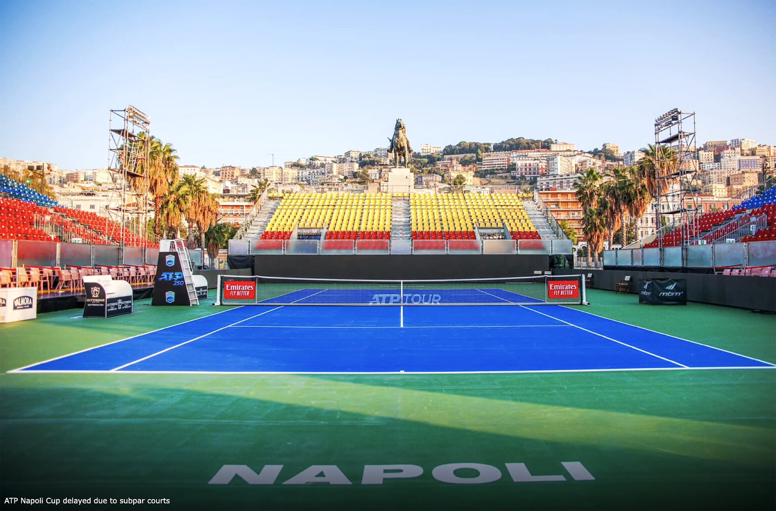 This week’s one-off ATP fill-in event in Naples has fallen victim to typical southern Italian chaos, with the start of competition delayed by at least a day until Tuesday due to unplayability of the temporary outdoor courts.