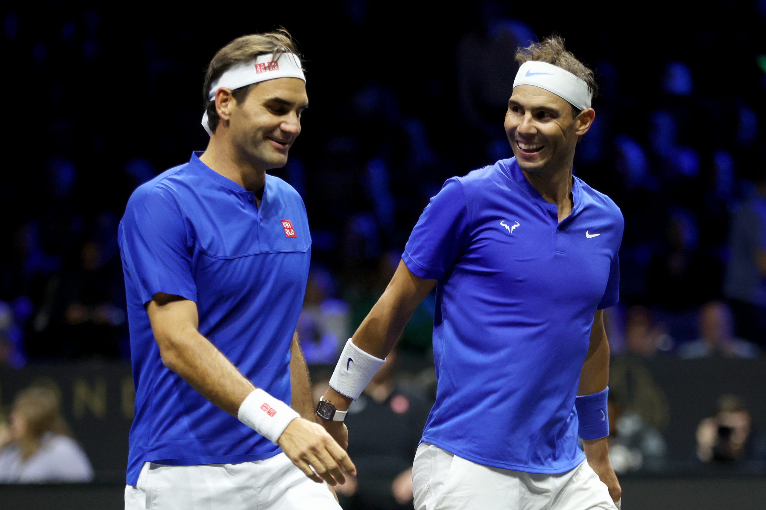 LONDON, ENGLAND - SEPTEMBER 23: Roger Federer and Rafael Nadal of Team Europe interact during the doubles match between Jack Sock and Frances Tiafoe of Team World and Roger Federer and Rafael Nadal of Team Europe during Day One of the Laver Cup at The O2 Arena on September 23, 2022 in London, England. (Photo by Clive Brunskill/Getty Images for Laver Cup)