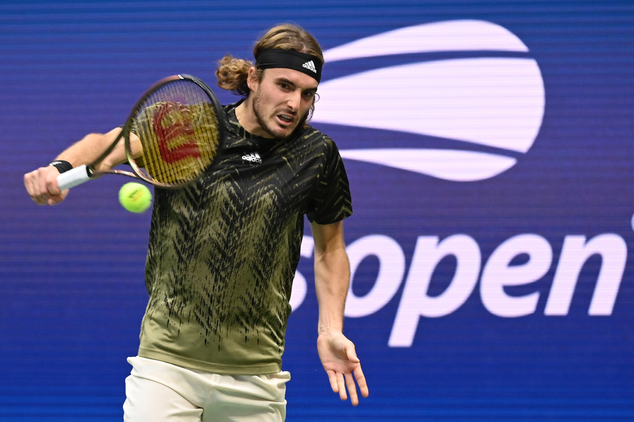 Stefanos Tsitsipas returns a shot during a Men's Singles match at the 2021 US Open, Friday, Sep. 3, 2021 in Flushing, NY. (Garrett Ellwood/USTA)