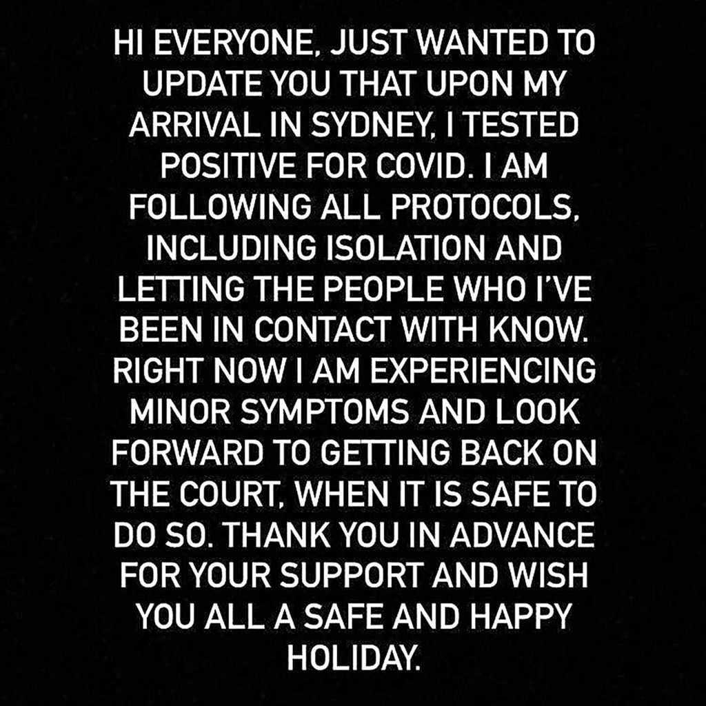 “Hi everyone, just wanted to update you that upon my arrival in Sydney, I tested positive for COVID,” Shapovalov tweeted.
