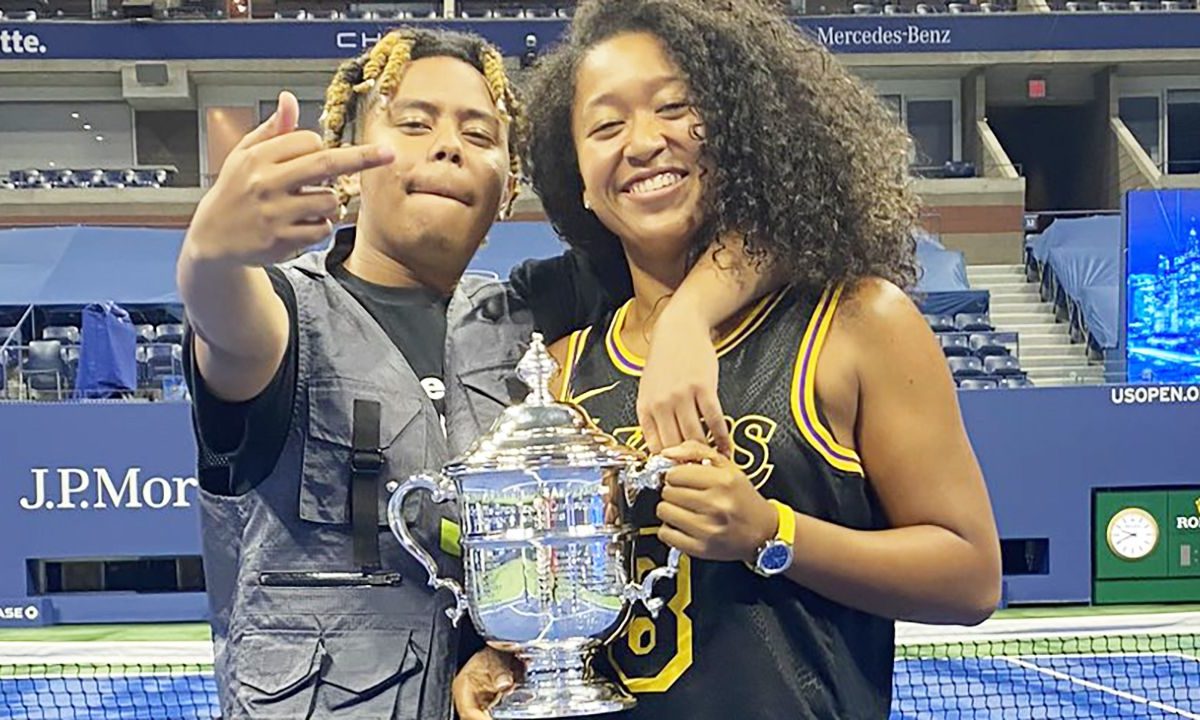 A smiling Osaka is on court with the winners’ trophy as Cordae is pictured flipping his middle to photographers.