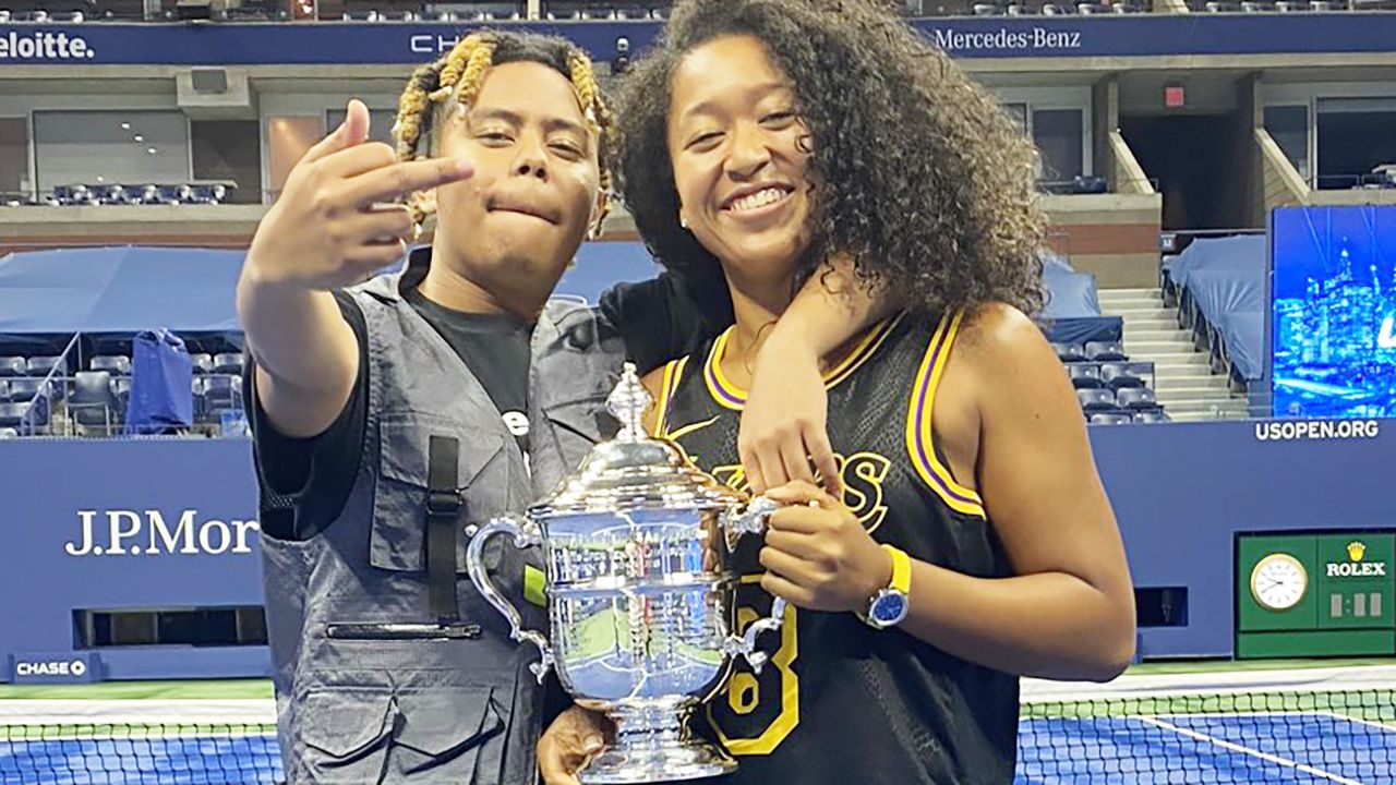 A smiling Osaka is on court with the winners’ trophy as Cordae is pictured flipping his middle to photographers.