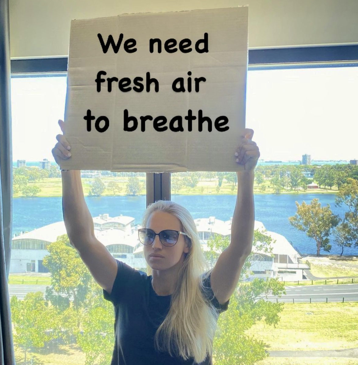 Putintseva posted a sign on social media that said, “We need fresh air to breathe”, adding that she needed 10 minutes a day outside or windows that opened.