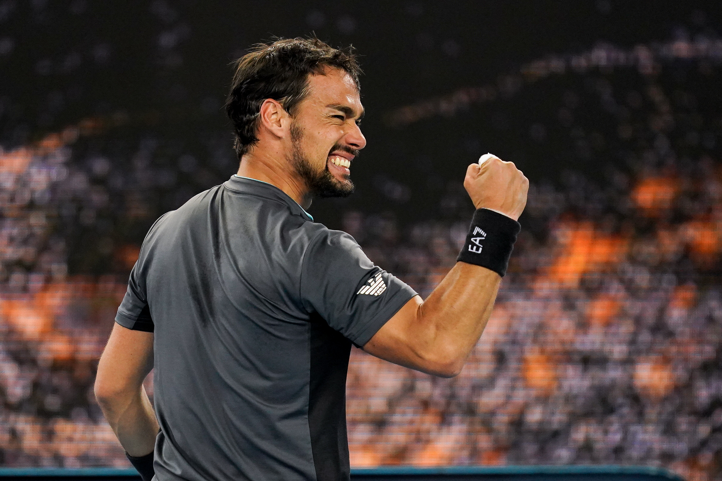 Fabio FOGNINI (ITA) celebrates winning match point against Alex DE MINAUR (AUS) on Margaret Court Arena during Day 6 of the Australian Open at Melbourne Park on Saturday, February 13, 2021. MANDATORY PHOTO CREDIT Tennis Australia/ NATASHA MORELLO