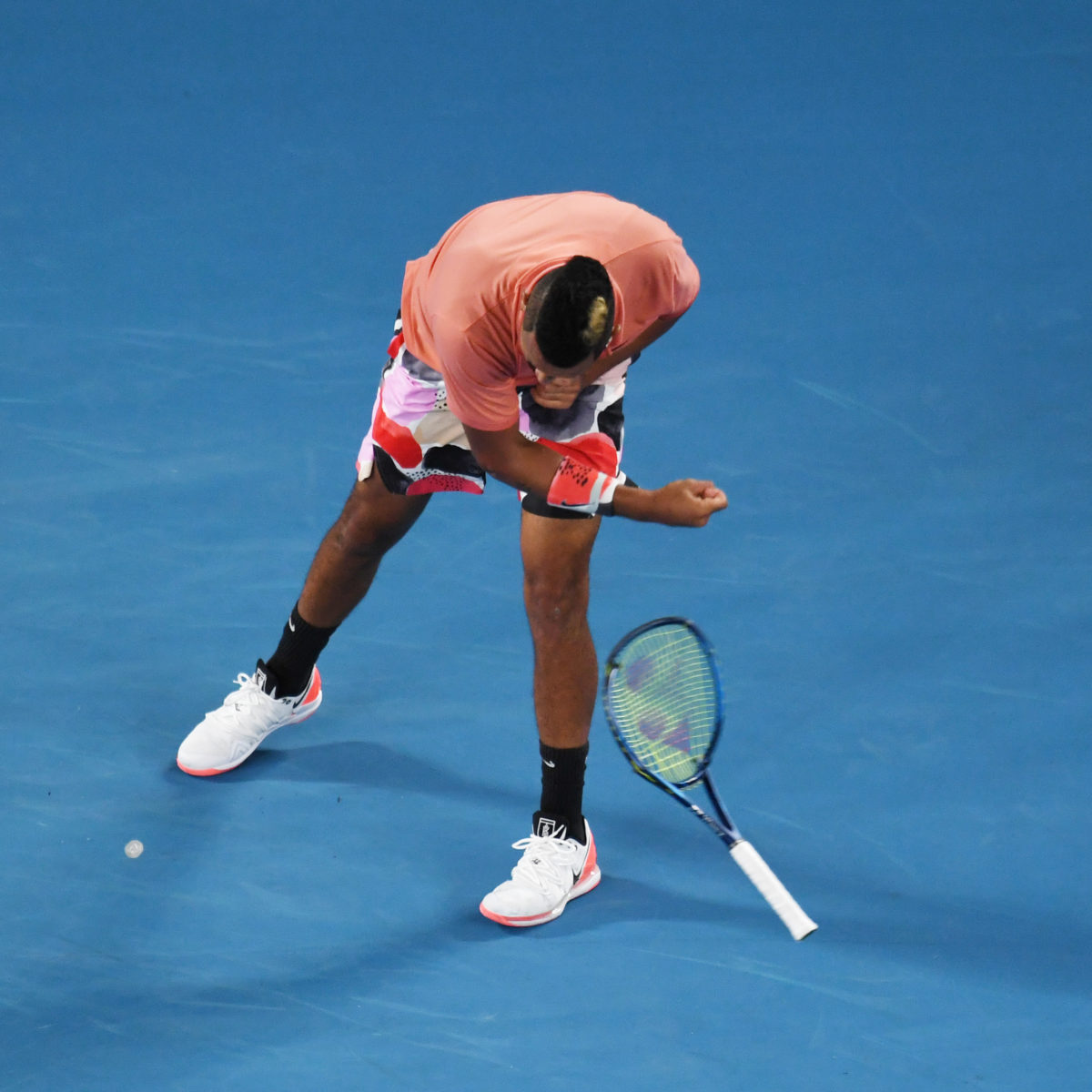 Main photo:- Australian Open 2020 Nick Kyrgios, already on a suspended sentence Kyrgios smashes his racket and gets a code violation from the umpire by Roger Parker International Sports Fotos Ltd