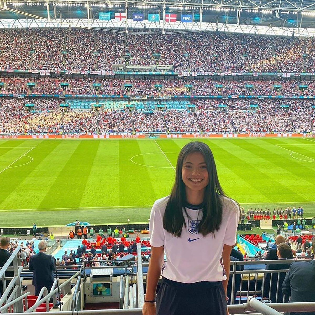 Following her disappointing retirement from her fourth round match on Wimbledon’s No. 1 court on Monday evening, Emma Raducanu switched her sporting attentions fifteen miles north across London to Wembley Stadium last night and lifted her spirits by cheering on England to beat Denmark 2-1 at Wembley and reach Sunday’s Euro 2020 Soccer final to play Italy.