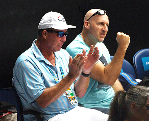 Melbourne Park Australian Open 2019 Day 2 15/01/2019 Sasha Zverev (GER) wins first round match watched by coach Ivan Lendl and physio Jez Green (rt) Photo Roger Parker International Sports Fotos Ltd https://www.grandslamtennis.online