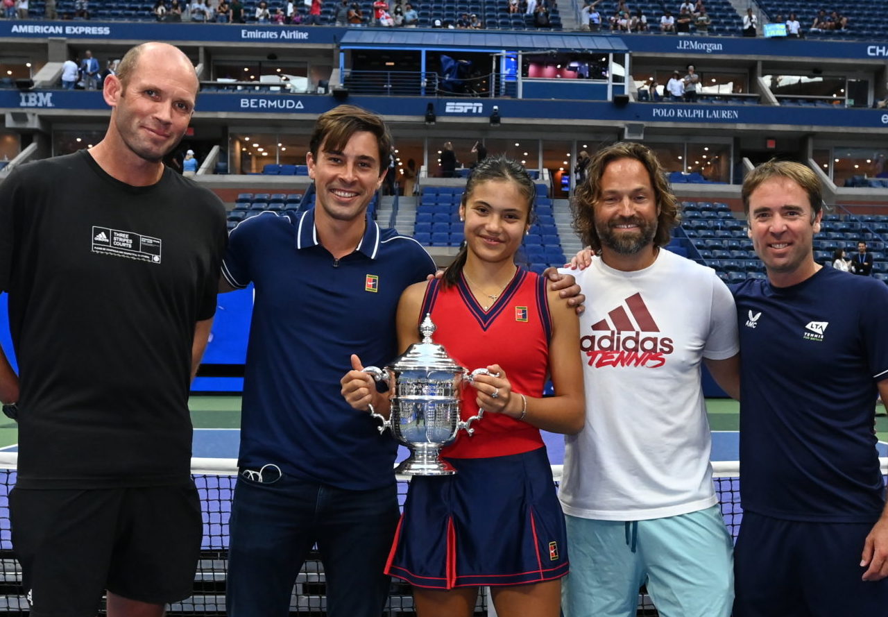 Women's Singles champion, Emma Raducanu poses for a photo with her coaching team at the 2021 US Open, Saturday, Sep. 11, 2021 in Flushing, NY. (Garrett Ellwood/USTA)
