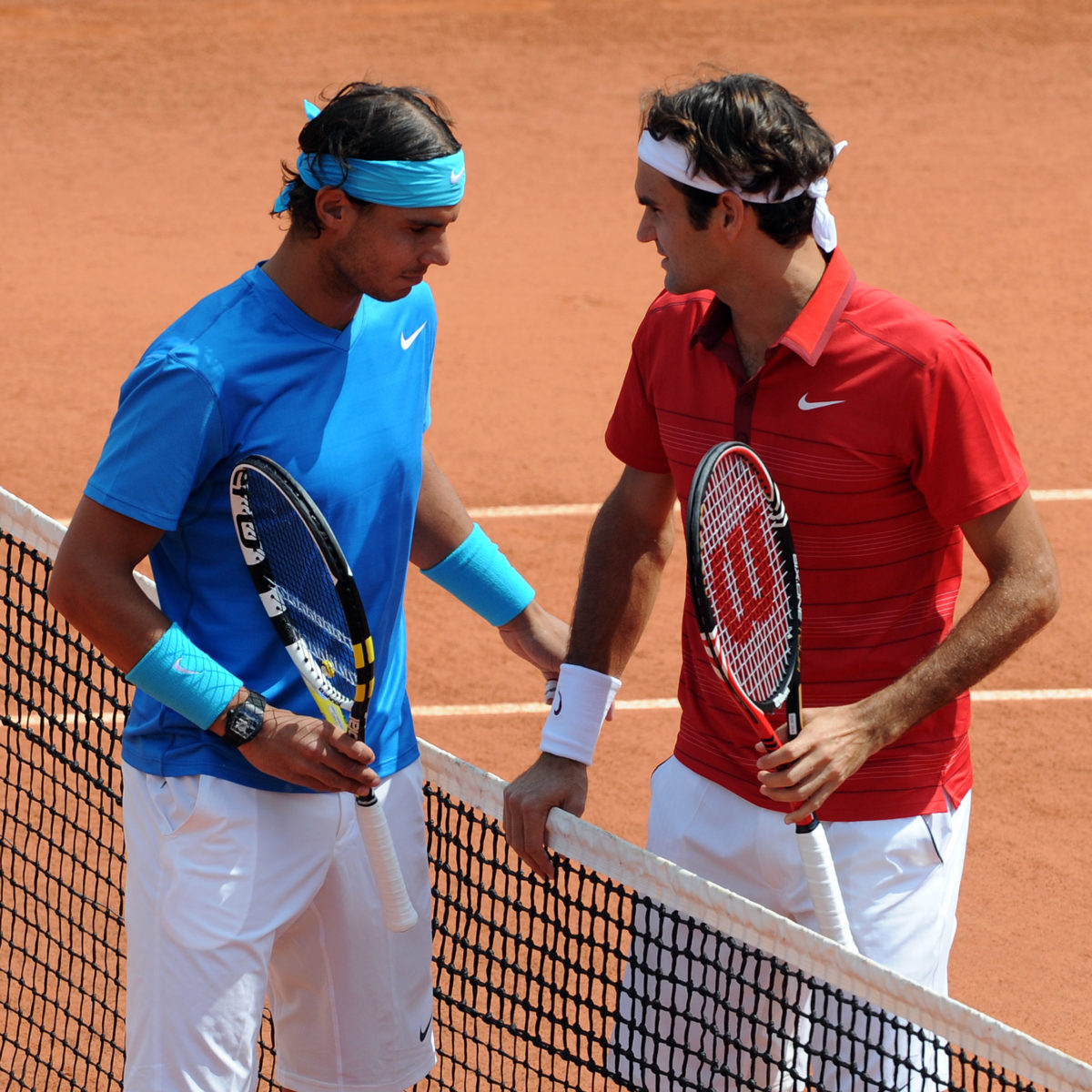 Main photo:- Roger Federer and Rafa Nadal on opposite side of the net at Roland – by Roger Parker International Sports Fotos Ltd