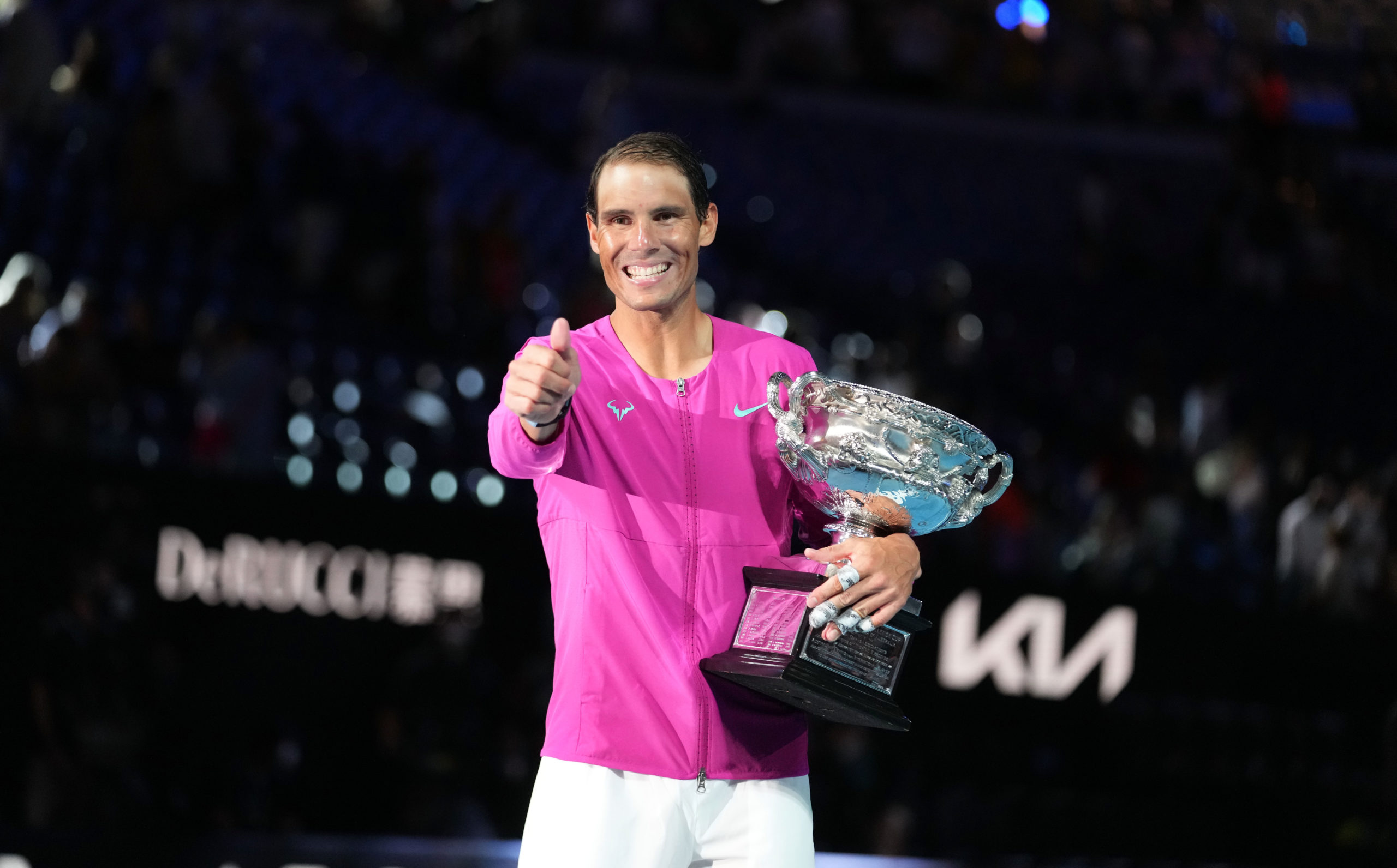 Rafael NADAL (ESP) poses for photos with the Norman Brookes Challenge Cup after the Australian Open men’s singles final on Rod Laver Arena at Melbourne Park in Melbourne on Monday, January 31, 2022. MANDATORY PHOTO CREDIT Scott Barbour/TENNIS AUSTRALIA