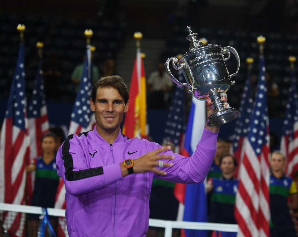 Rafa Nadal with winners trophy after he wins. Photo: Roger Parker International Sports Fotos Ltd/Alamy Live News