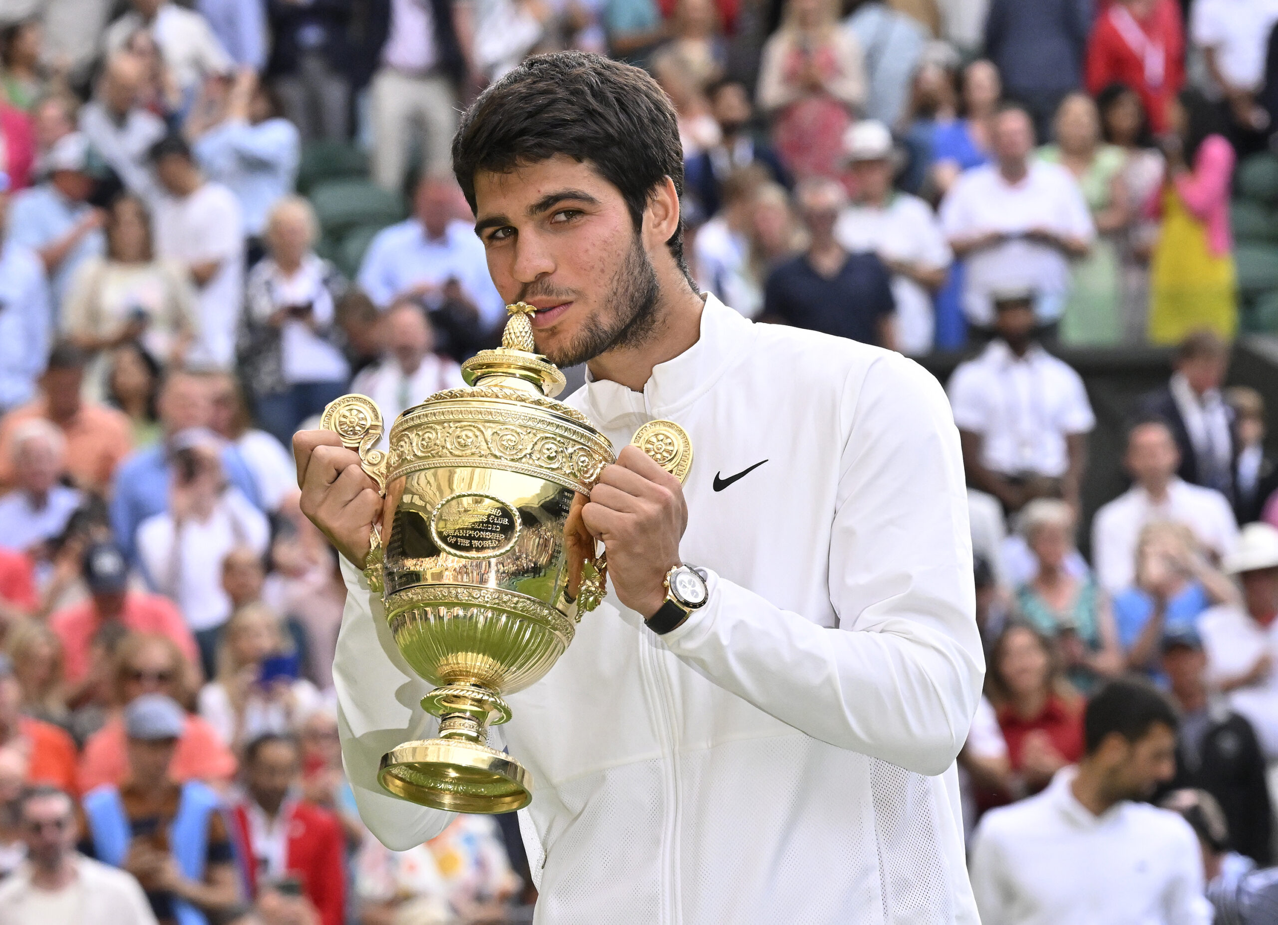 London Wimbledon Championships Day 14 15/07/2023 Carlos Alcaraz (ESP) celebrates with trophy as he wins Men’s Singles Final Photo Roger Parker International Sports Fotos Ltd