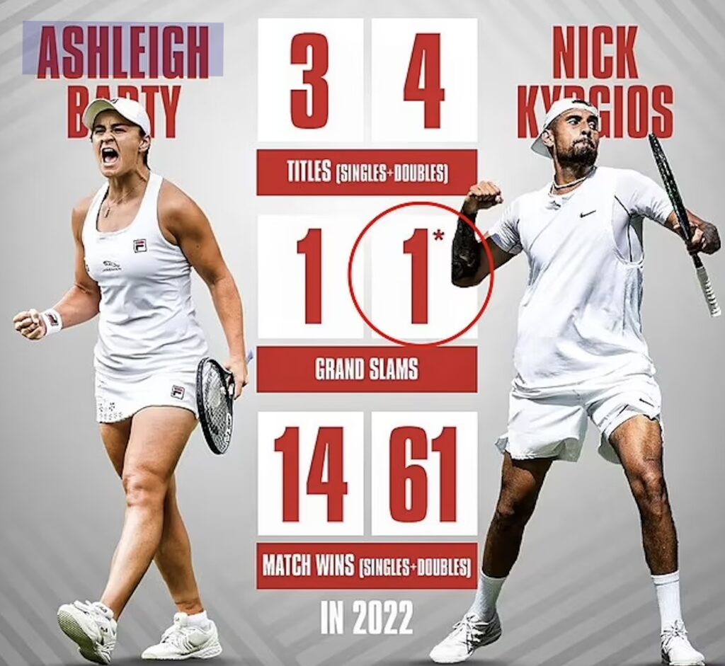 He also posted a graphic that showed Barty with three titles and Kyrgios with four (including both doubles and singles), and then said both had won a Grand Slam each.