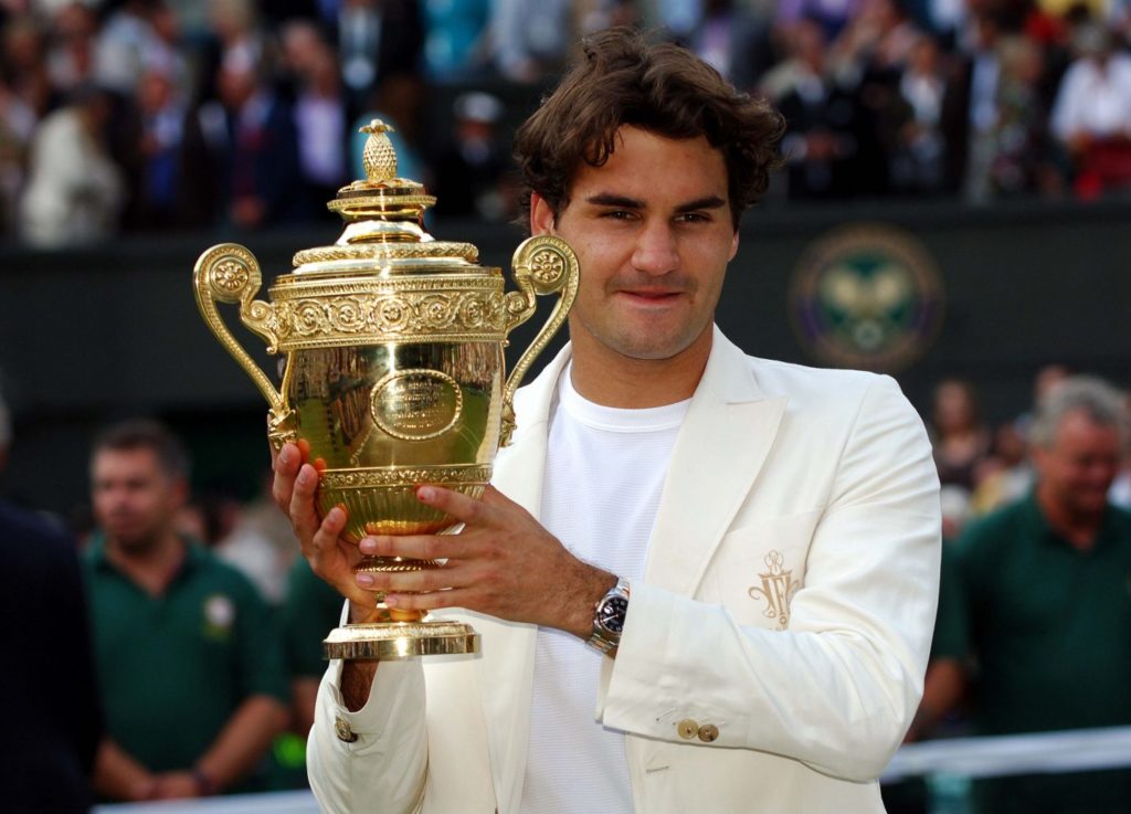 Wimbledon Championships Day 13 09/07/2006 Photo Tim Parker Fotosports International Roger Federer (SUI) celebrates winning the final of mens singles with the trophy