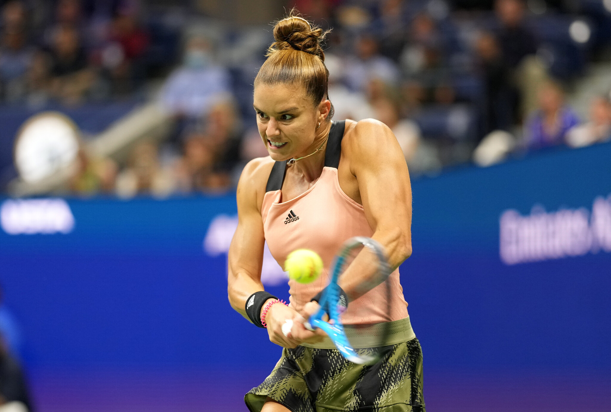 Maria Sakkari hits a backhand during a Women's Singles semifinal match at the 2021 US Open, Thursday, Sep. 9, 2021 in Flushing, NY. (Darren Carroll/USTA)