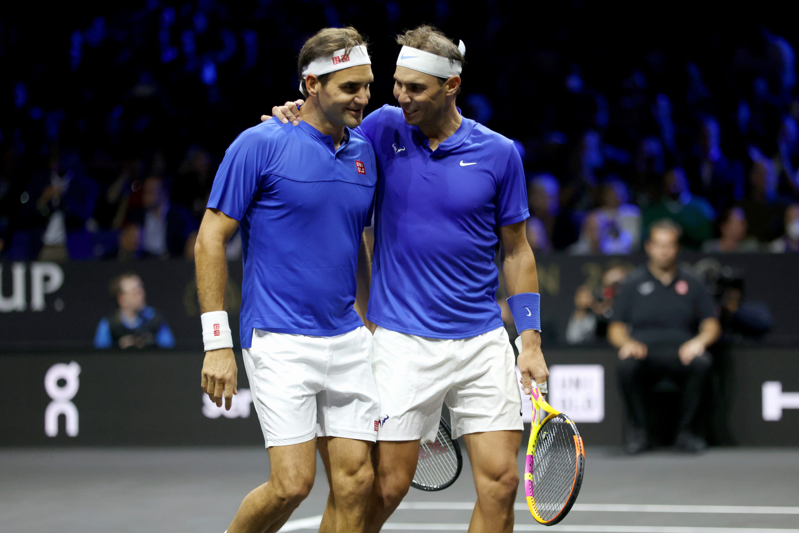 LONDON, ENGLAND - SEPTEMBER 23: Roger Federer and Rafael Nadal of Team Europe interact during the doubles match between Jack Sock and Frances Tiafoe of Team World and Roger Federer and Rafael Nadal of Team Europe during Day One of the Laver Cup at The O2 Arena on September 23, 2022 in London, England. (Photo by Clive Brunskill/Getty Images for Laver Cup)