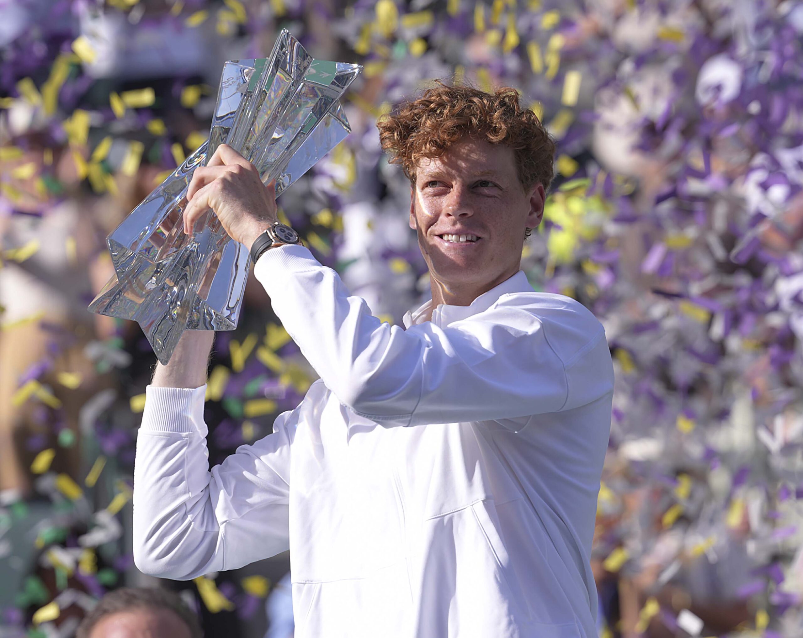 Main photo:- Jannik Sinner poses with Indian Wells trophy – by ISF Ltd