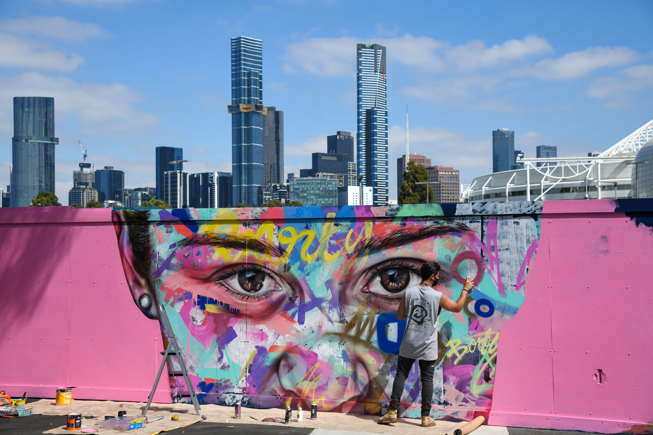 Monty Paink is seen working on his Ashleigh BARTY (AUS) artwork during Day 8 of the Australian Open at Melbourne Park on Monday, February 15, 2021. Paink has painted murals of Serena WILLIAMS, Novak DJOKOVIC and Rafael NADAL during the Australian Open. MANDATORY PHOTO CREDIT Tennis Australia/ VINCE CALIGIURI