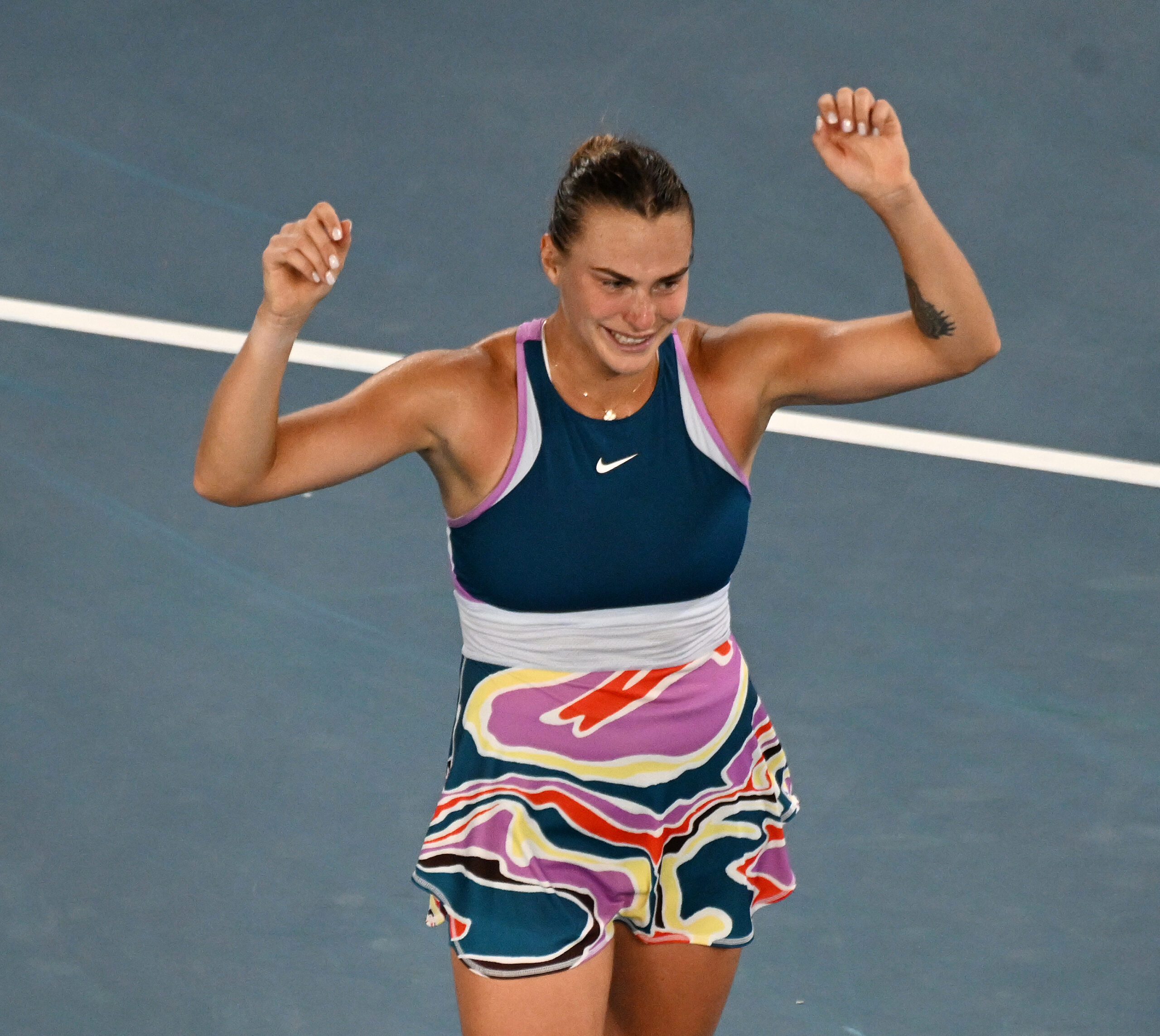 Main photo:- Australian Open 2023 Aryna Sabalenka (xxx) celebrates after she wins Ladies Singles Final Photo Roger Parker International Sports Fotos Ltd