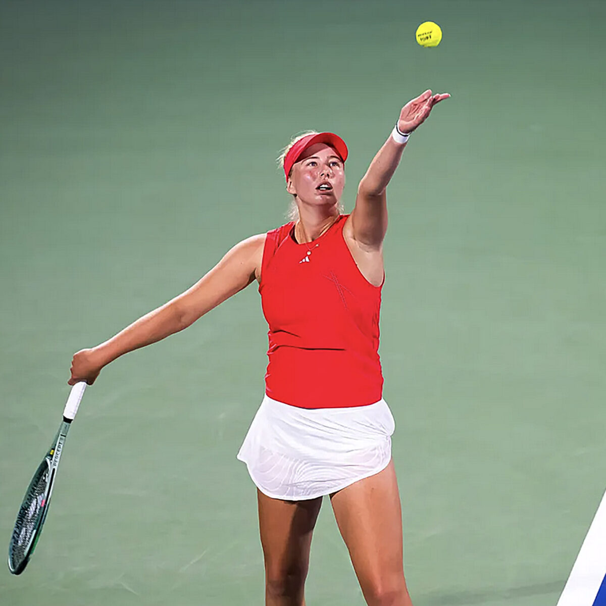 Main photo:- Clara Tauson serving to Aryna Sabalenka – by WTATennis.com