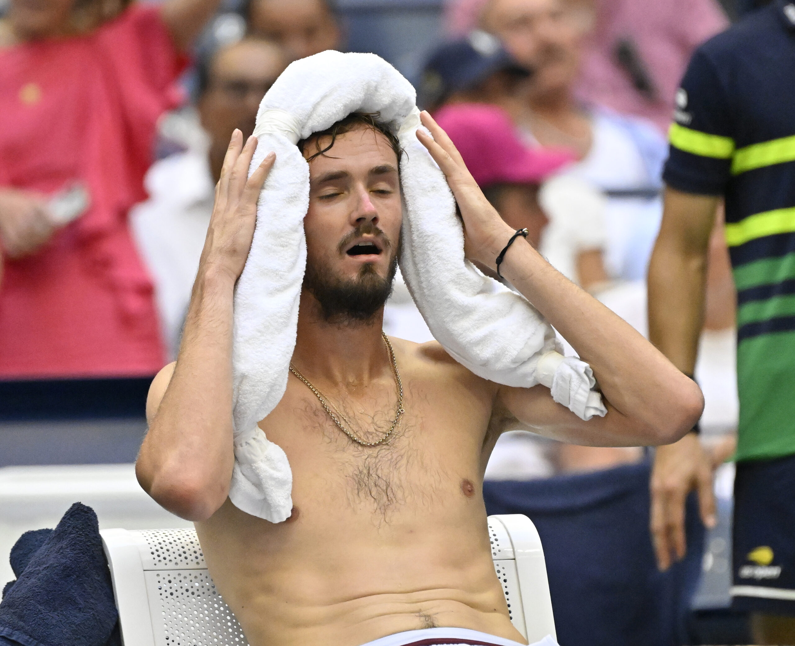 US Open Flushing Meadows New York 06/09/2023 Day 10 Daniil Medvedev (xxx) cools down after he wins quarter final match Photo Roger Parker International Sports Fotos Ltd