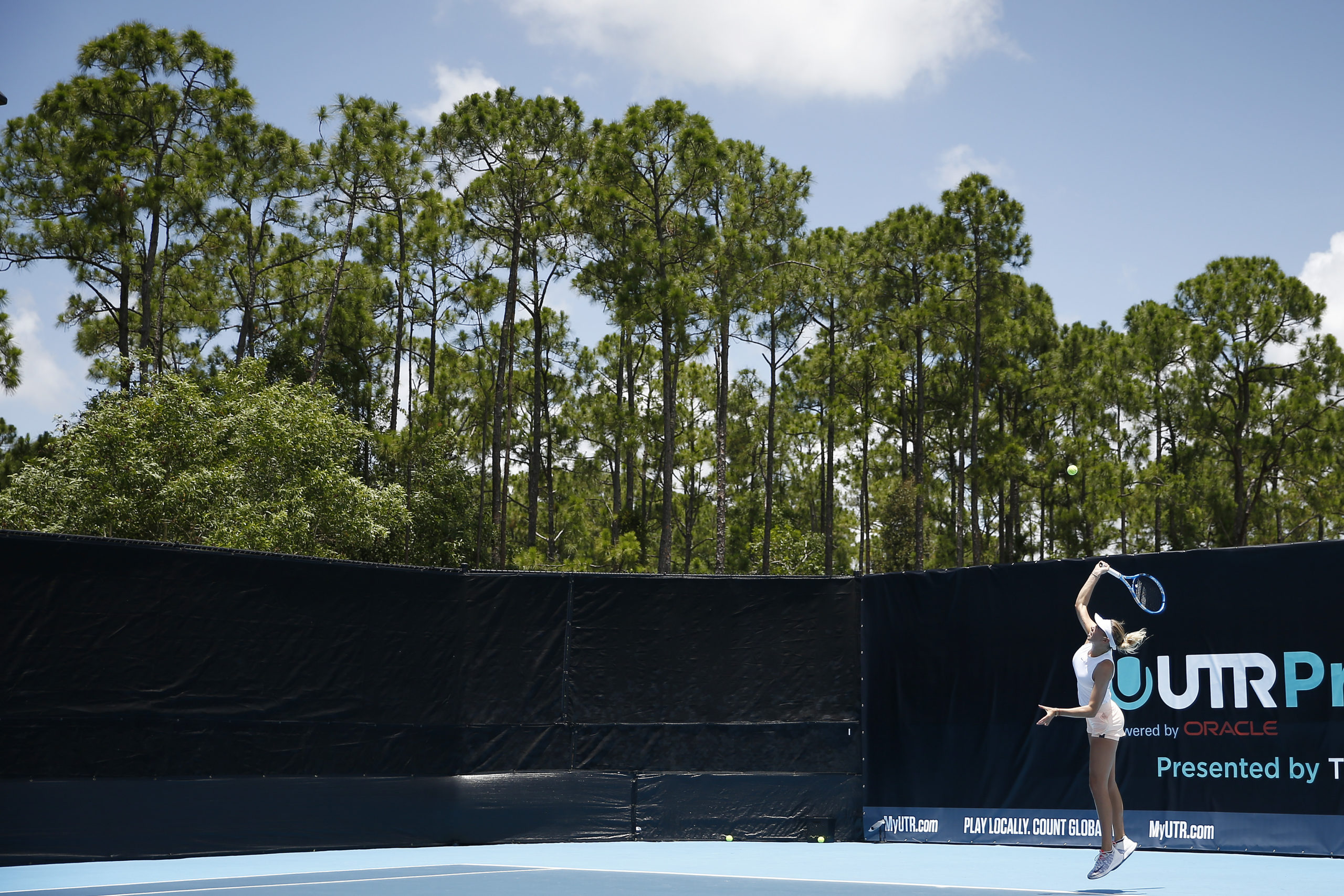 WEST PALM BEACH, FLORIDA - MAY 22: Amanda Anisimova of the United States serves to Danielle Collins of the United States during the UTR Pro Match Series Day 1 on May 22, 2020 in West Palm Beach, Florida. (Photo by Michael Reaves/Getty Images)