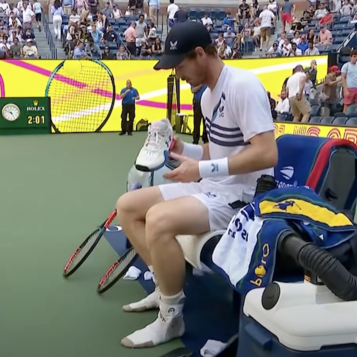 Former world No. 1 Andy Murray took a novel approach to drying his shoes in a break of play against Stefanos Tsitsipas at the US Open on Monday.