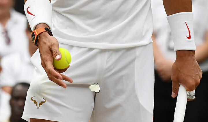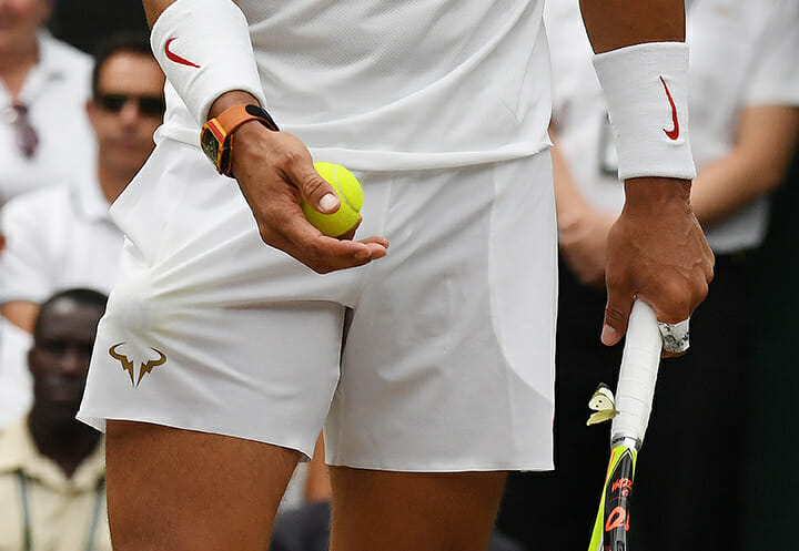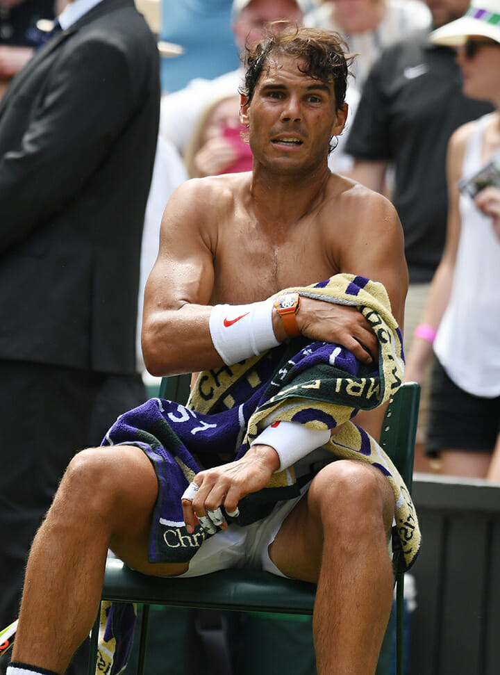 Prolific perspirer Rafa Nadal’s obligatory between sets shirt change and towel down, followed by his OCD placement of his on court liquid refreshments. ‘Nuff said!