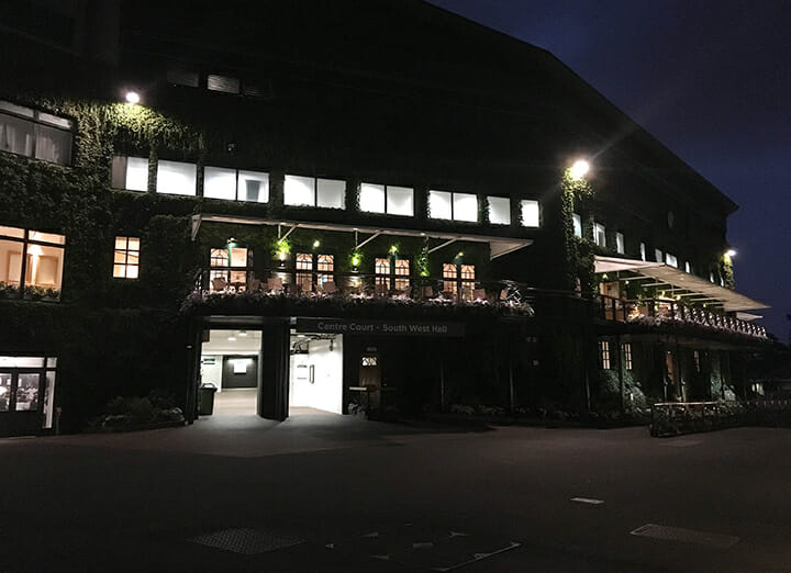 Even after hours, activity goes on all night at the All England Club. Security checks, litter cleaning, preparing the hospitality and concession facilities for the next days guests.