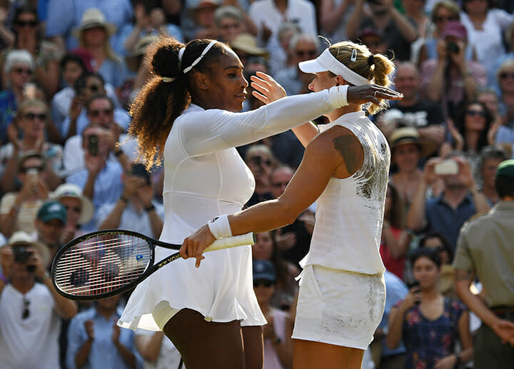 Serena Williams, who was chasing Margaret Court’s record of 24 singles titles and playing in her first final since giving birth to her daughter Alexis Olympia a year ago, congratulates winner, Germany’s 30-year-old Angelique Kerber, who now has three Grand Slam Singes titles: 2016 Australia, 2016 US Open, 2018 Wimbledon and career earnings of US$23,000,000.