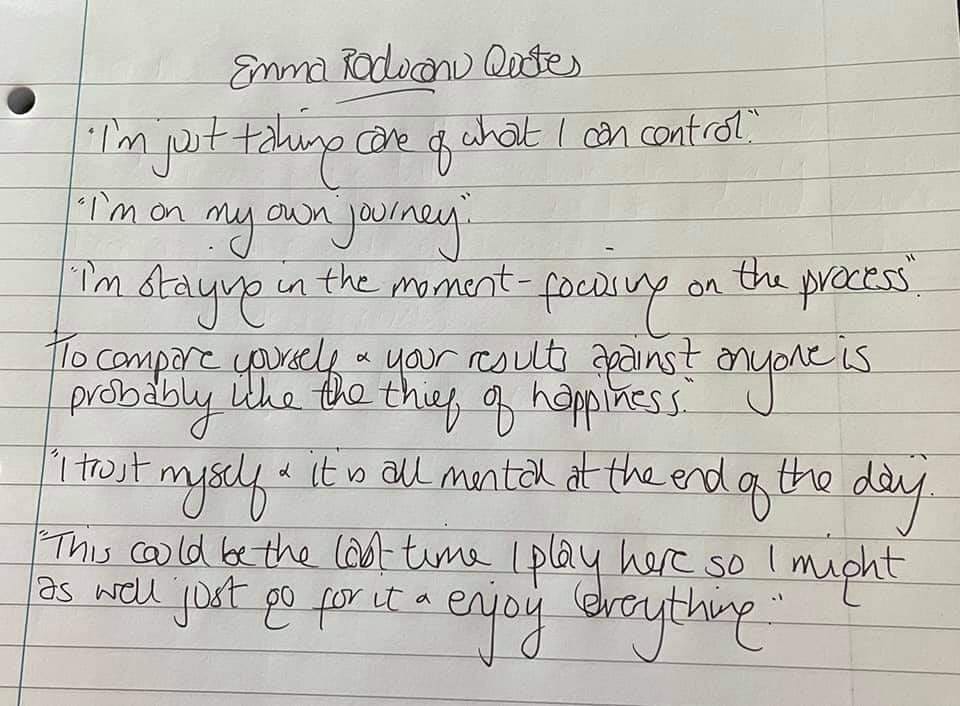 Emma Raducanu’s notes to self from US Open Tennis Championships. Shared by her sports psychologist. Gold dust for coaches/parents/players: