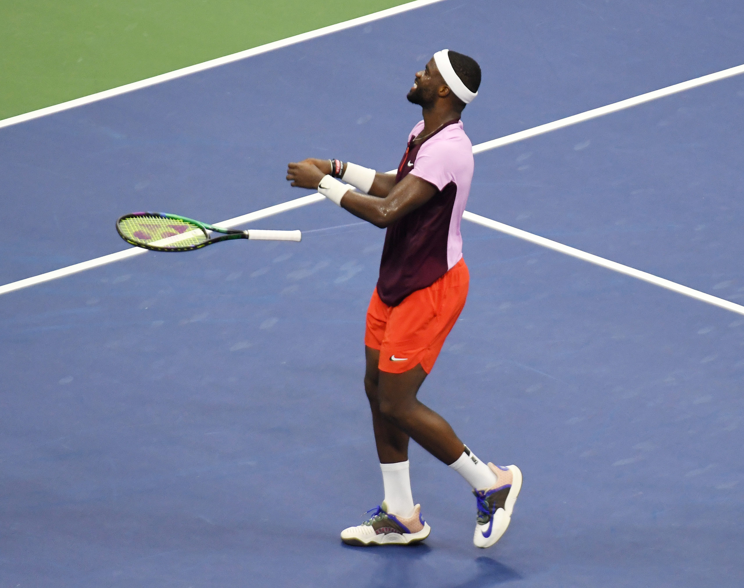 Main photo:-Frances Tiafoe tosses his racket away after beating Rafa Nadal – by Roger Parker International Sports Fotos Ltd