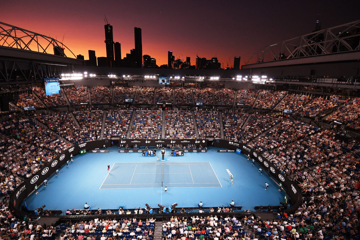Melbourne Park Australian Open Day 11 30/01/20 Novak Djokovic (SRB) beats Roger Federer (SUI) in semi-final on Rod Laver Arena as the sun sets on downtown Melbourne Photo Roger Parker International Sports Fotos Ltd