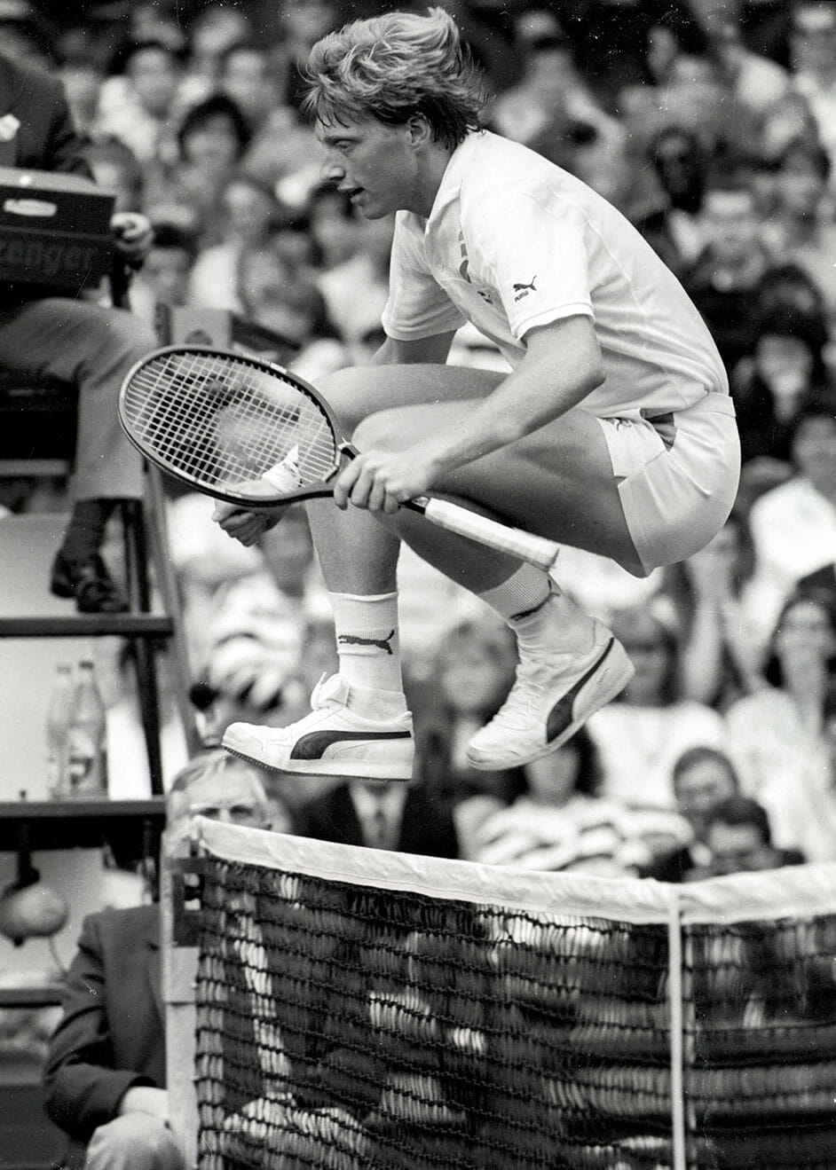 Main photo:- Boris Becker leaps the net during his first Wimbledon in 1985 – by Roger Parker International Sports Fotos Ltd