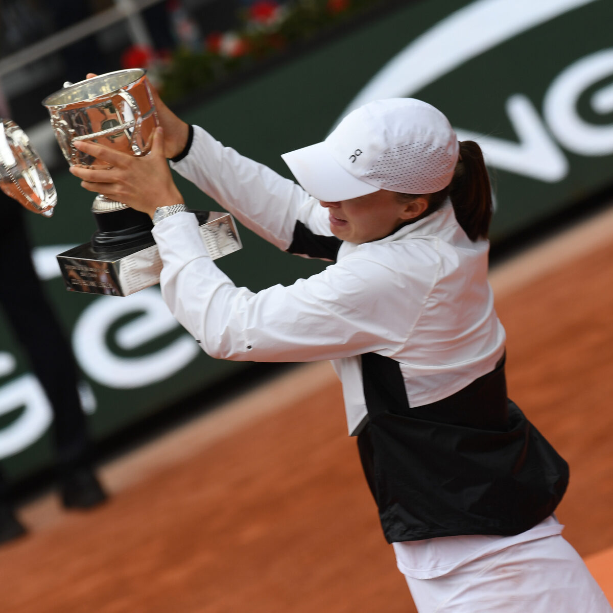 Swiatek was able to laugh as she lost the top to the Suzanne Lenglen trophy as she held it aloft at the ceremony only to have the crown of the silver salver tumble off onto the clay.