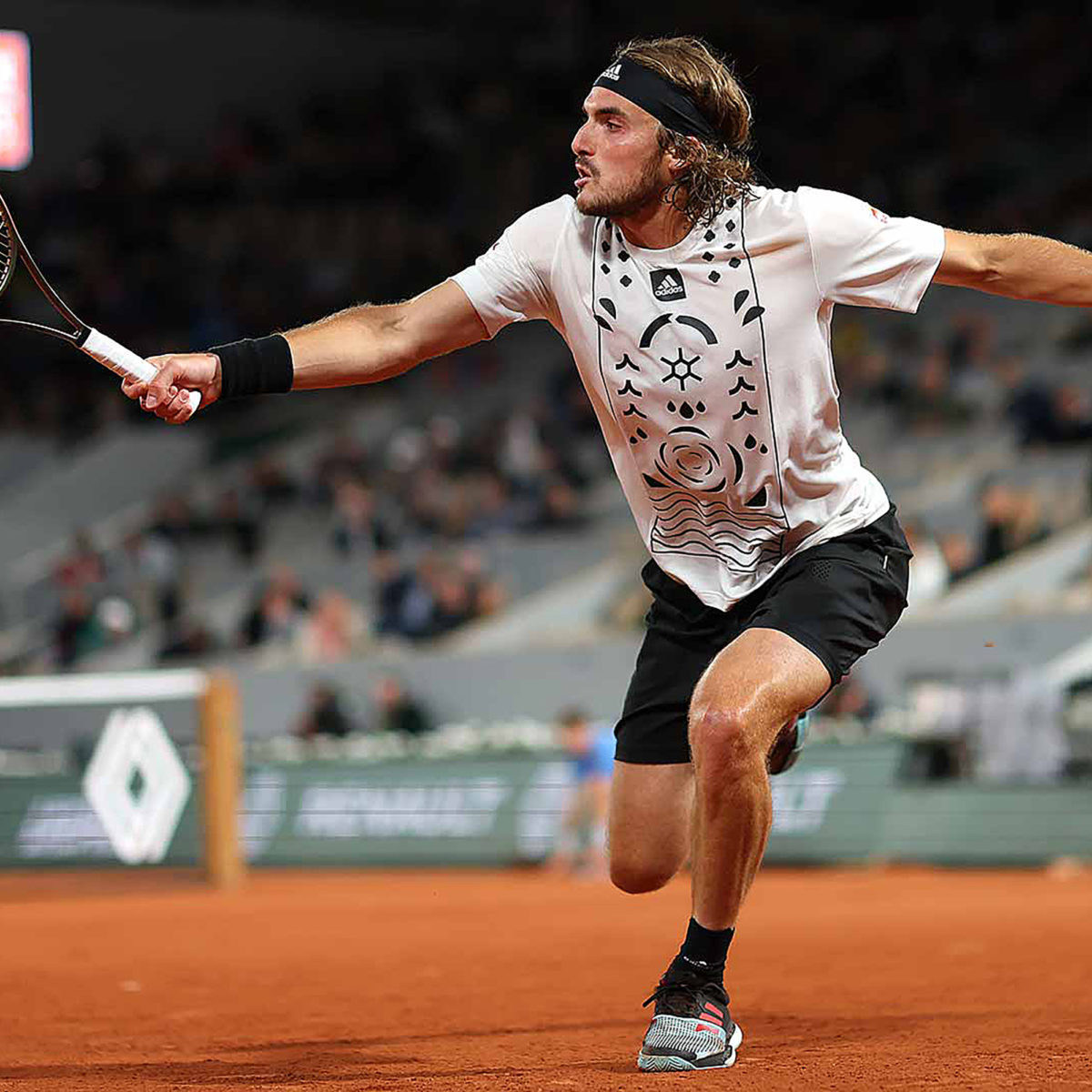 Main photo:-Stefanos Tsitsipas at full stretch in late night victory – by ATPTour.com