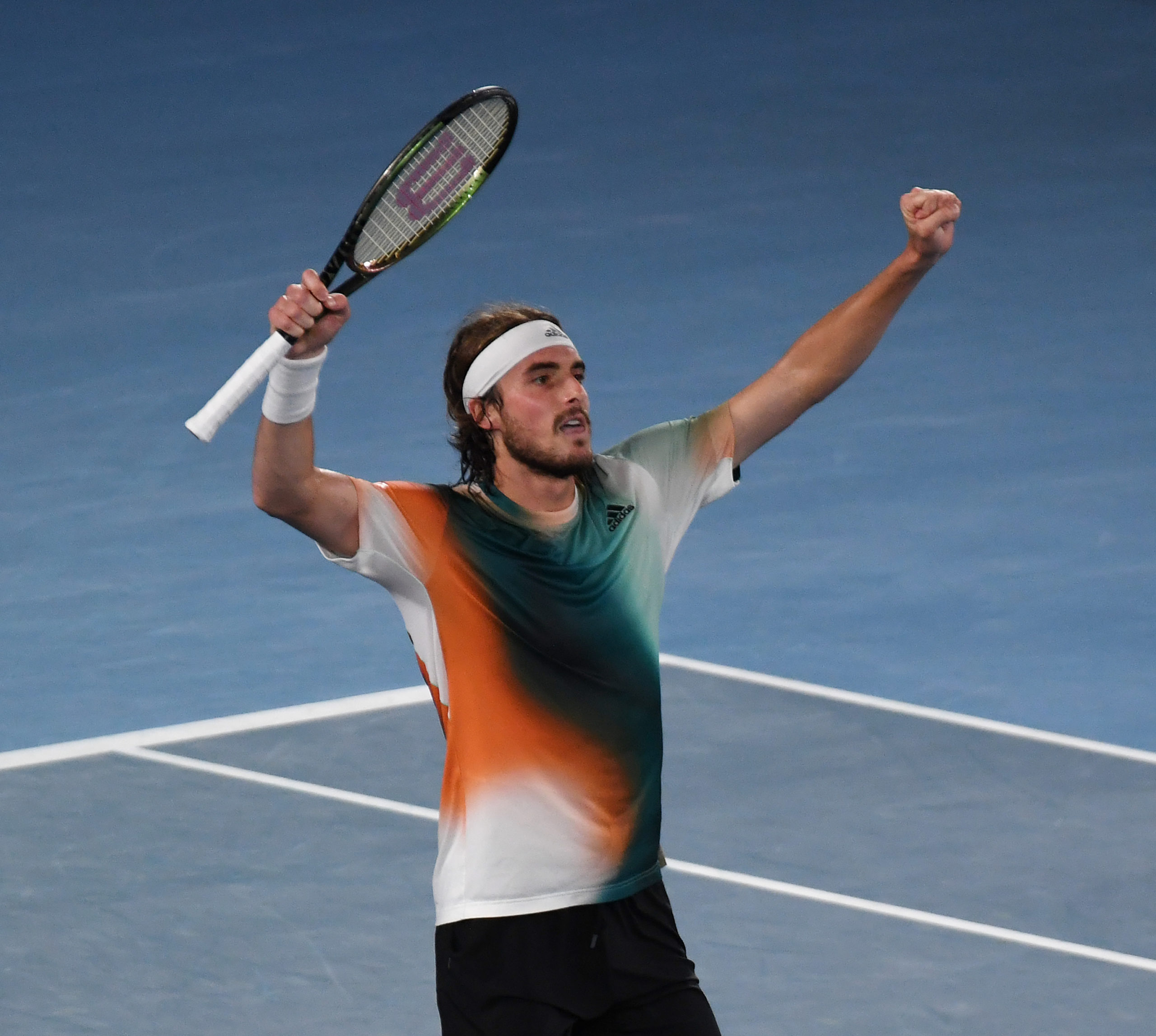 Australian Open Melbourne Park Day 12 2/01/2022 Stefanos Tsiitsipas (GRE) celebrates as he wins second set in Men’s Semi-Final Photo Roger Parker International Sports Fotos Ltd