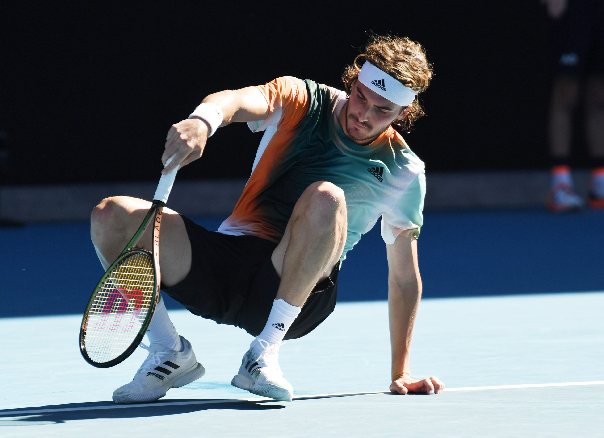 Australian Open Melbourne Park Day 6 22/01/2022 Stefanos Tsitsipas (GRE) takes a fall in third round Match Photo Roger Parker International Sports Fotos Ltd