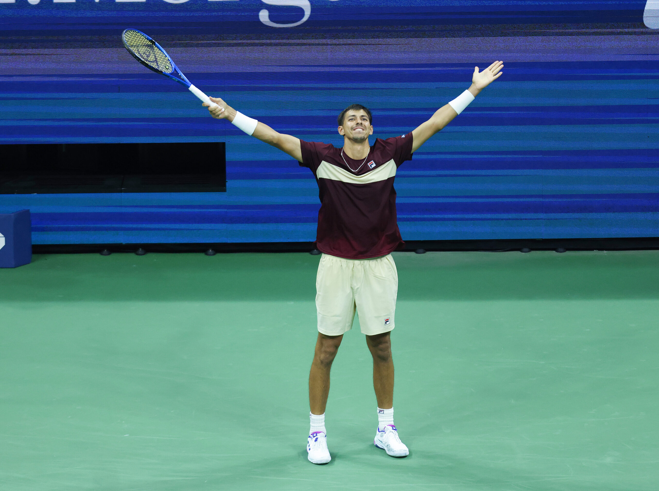 Alexei Popyrin (AUS) celebrates winning his third round match in the 2024 US Open Tennis Novak Djokovic (SRB)