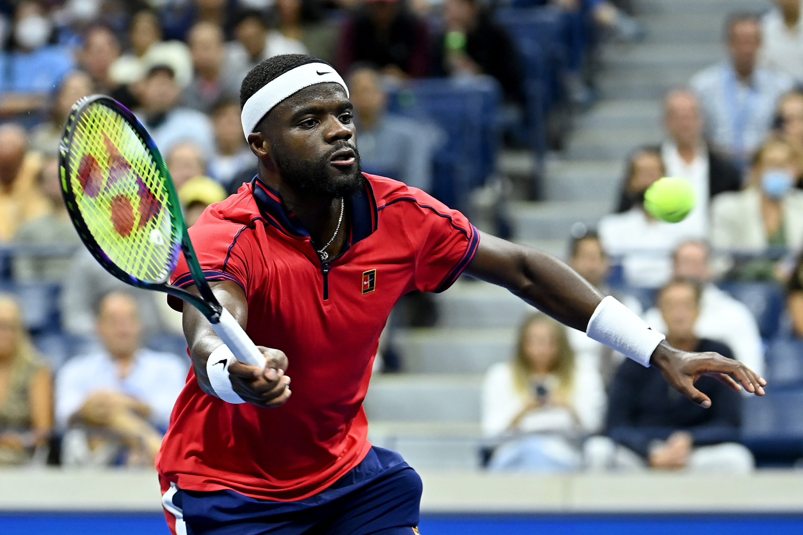 Frances Tiafoe returns a shot during a Men's Singles match at the 2021 US Open, Friday, Sep. 3, 2021 in Flushing, NY. (Pete Staples/USTA)