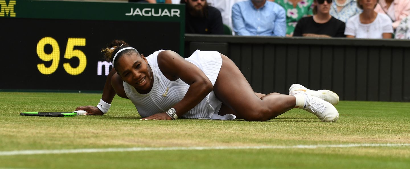 London,England The Championships Wimbledon Day 8 09/07/2019 Down but not out, Serena Williams (USA) takes a fall as she wins quarter final Photo Roger Parker International Sports Fotos Ltd