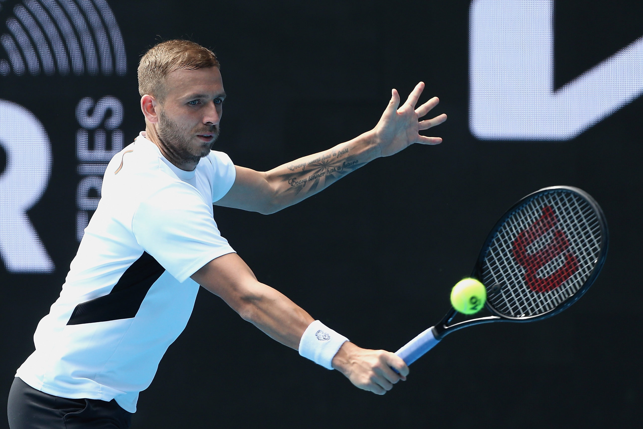 Daniel EVANS (GBR) plays Felix AUGER-ALIASSIME (CAN) on Margaret court Arena during the final on Day 6 of the ATP 250 Murray River Open at Melbourne Park on Sunday, February 7, 2021. MANDATORY PHOTO CREDIT Tennis Australia/ Rob Prezioso
