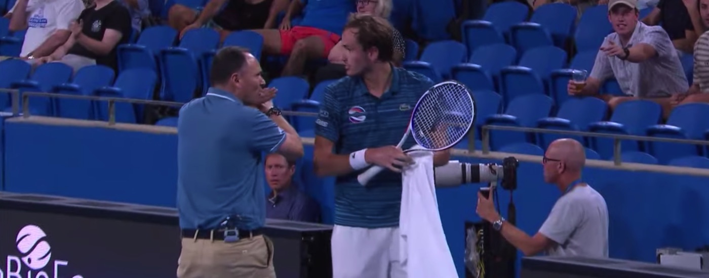 Medvedev received a warning for unsportsmanlike behaviour after arguing with world no.13 Diego Schwartzman during a changeover, with umpire Mohamed Lahyani jumping from his chair to separate the pair.