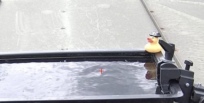 A tub filled with water on top of an on-site building, completed with its own rubber duck, is used to see if rain is falling.