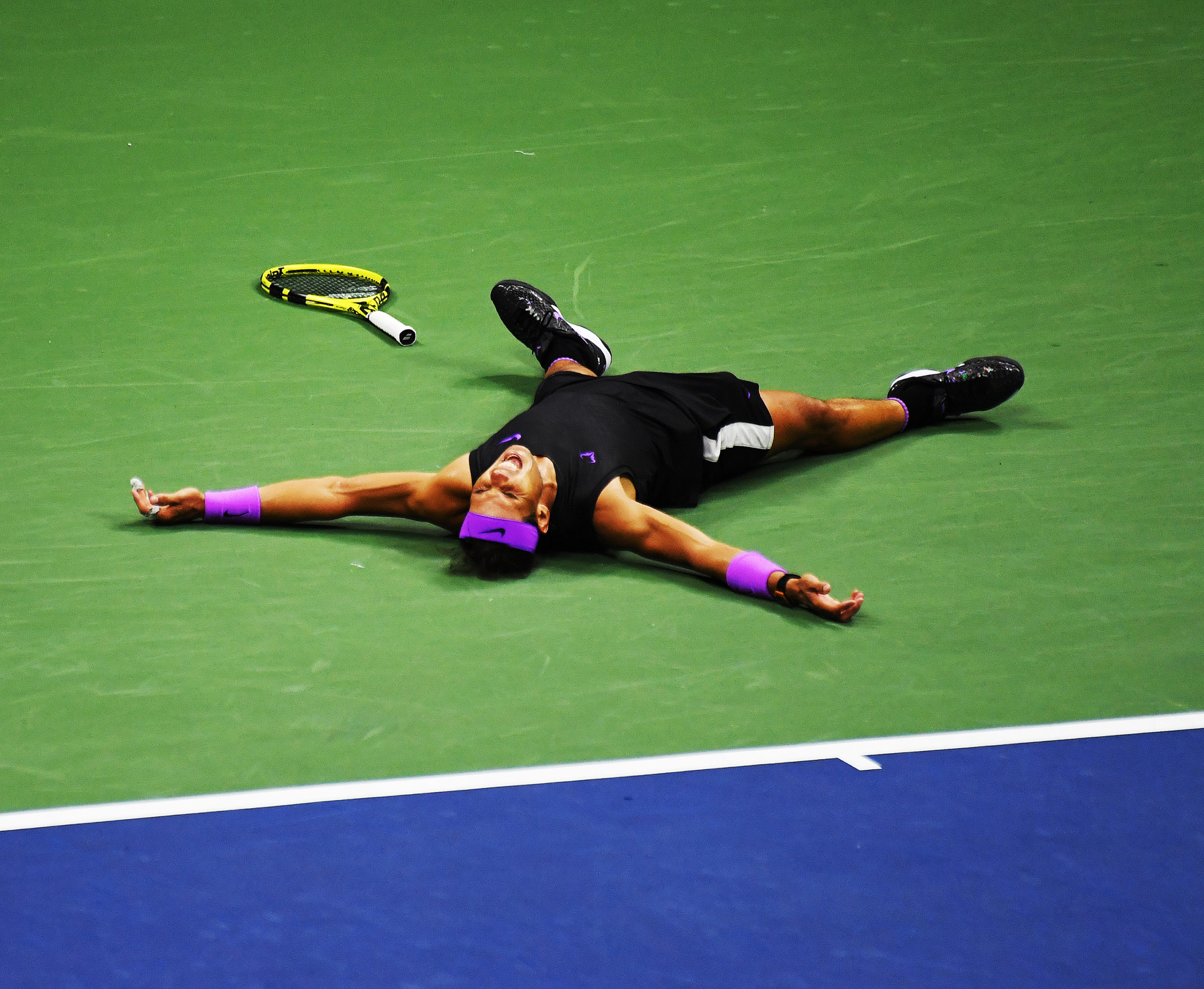 Flushing Meadows New York US Open Tennis Day 14 08/09/2019 Rafa Nadal (ESP) falls on his back after he wins Menâs Singles Final Photo Roger Parker International Sports Fotos Ltd/Alamy Live News
